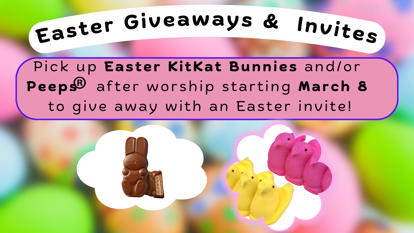 A sweet way to invite and share about all our Easter happenings is to give away an invite that's attached to Easter candy! This year we have KitKat Chocolate Bunnies along with marshmallow Peeps. Pick up a few after Sunday worship for random acts of kindness or for that someone you've been meaning to invite to Garfield. Thanks for all you do to Widen our Circle!