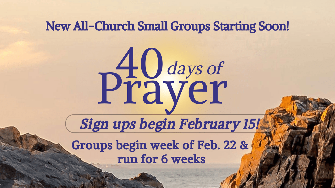 Join us for our "40 Days of Prayer” all-church study, beginning the week of February 22nd and running until Easter Sunday (6 weeks). As we meet each week in small groups, we will grow in our prayer lives and in intimacy with God, using Pastor Rick Warren's 40 Days of Prayer study guide. Our teaching series throughout the season of Lent will focus on the transformative power of prayer! Sign ups will start Feb. 15- watch for link on this page!